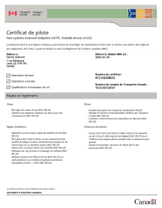 La personne dont le nom figure ci-dessous peut exercer les avantages de l’autorisation à faire voler un drone sous réserve des règles et des règlements de la liste ci-après et établis en vertu du Règlement de l’aviation canadien (RAC).