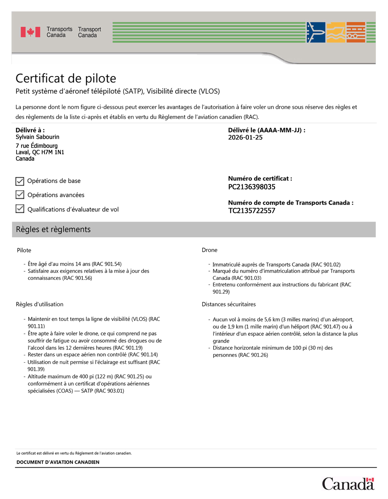 - Immatriculé auprès de Transports Canada (RAC 901.02)